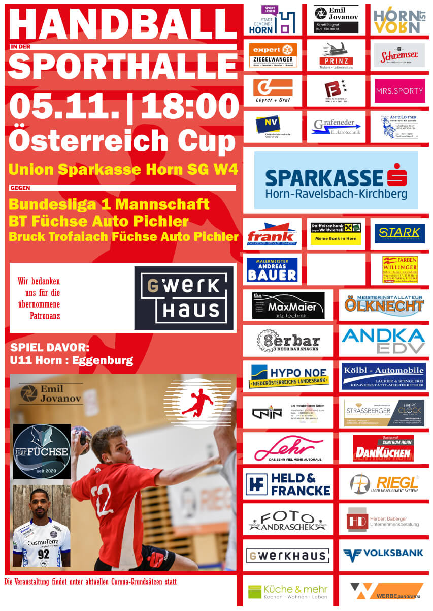 Am Samstag um 18 Uhr treten die BT Füchse in der Horner Sporthalle an. Großer Star der Spielgemeinschaft von Bruck/Mur und Trofaiach ist Raul Santos. Der linke Flügel trat 89 Mal für die österreichische Nationalmannschaft an, erzielte dabei 309 Treffer und spielte lange in Deutschland für Gummersbach, Kiel und Leipzig. „Die Chance gegen so einen Verein ist natürlich nicht sehr groß. Wir wollen mithalten und das Spiel so lange wie möglich spannend machen“, sagt Herbert Steinhauser. „Wir hoffen auf eine volle Halle. Gegner von so einem Kaliber kommen nicht so oft nach Horn. Das wird ein großes Handball-Fest.“ Die Horner sind in der aktuellen Saison noch ungeschlagen, gewannen den NÖ-Cup und feierten in der ersten vier Spielen in der Regionalliga Ost vier Siege. Die Horner nutzten die Pause seit dem Auswärtssieg bei den Handball Wölfen Wien am 23. Oktober, um einerseits den kompletten Kader wieder fit zu bekommen und um sich andererseits voll auf das Cup-Match vorzubereiten. „Für uns ist das Match ein ganz großes Saison-Highlight. Wir werden alles geben, damit wir den großen Favoriten ärgern können“, so Steinhauser. Am Samstag spielt zunächst die U11 um 16 Uhr, ehe um 18 Uhr das Cupmatch beginnt.