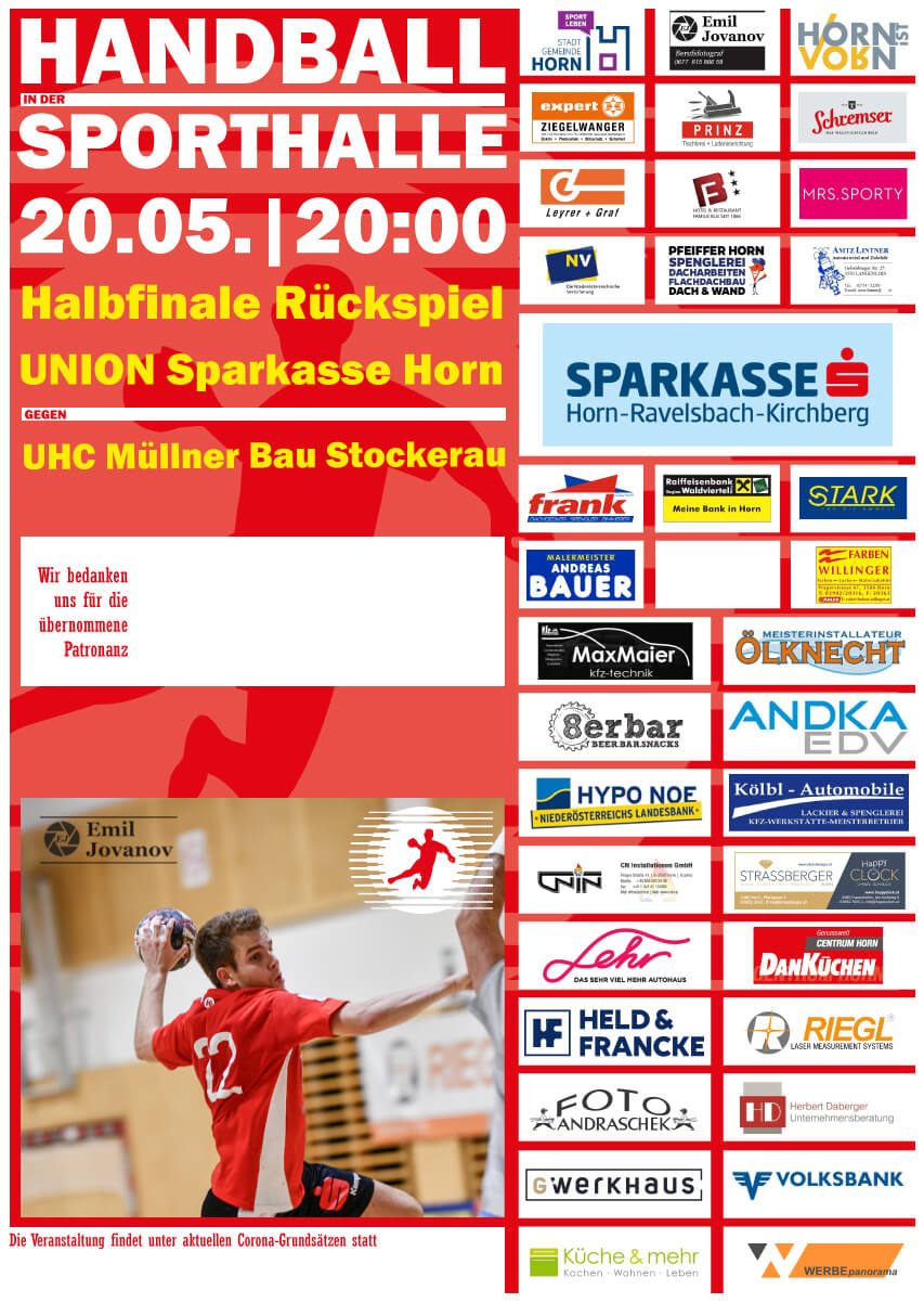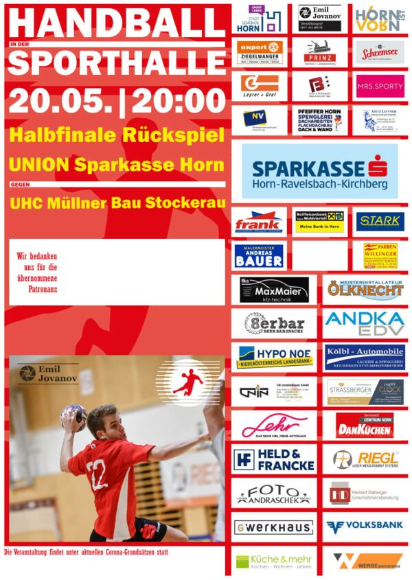 HALBFINALE RÜCKSPIEL20:00 Uhr - Handball Union Sparkasse Horn - UHC Müllner Bau StockerauNach den gültigen Corona-Regeln!