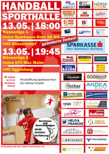 Samstag, 13.05.202319:45 Uhr - Union Sparkasse Horn SG W4 – UHC GänserndorfPatronanz: Privatstiftung Sparkasse Horn - Dir. Helmut Scheidl