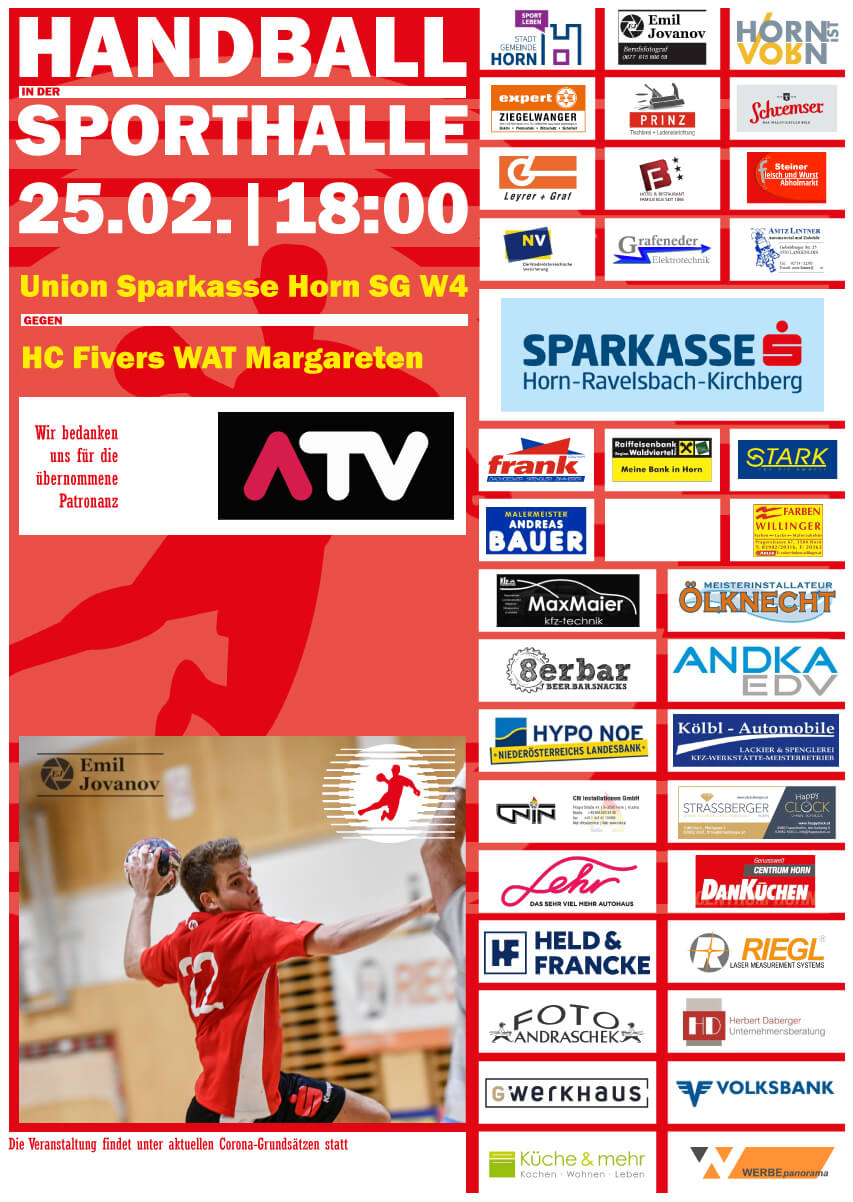 Samstag, 25.02.202318:00 Uhr - ML1 Union Sparkasse Horn SG W4 – HC Fivers WAT MargaretenPatronanz: ATVNach den gültigen Corona-Regeln!