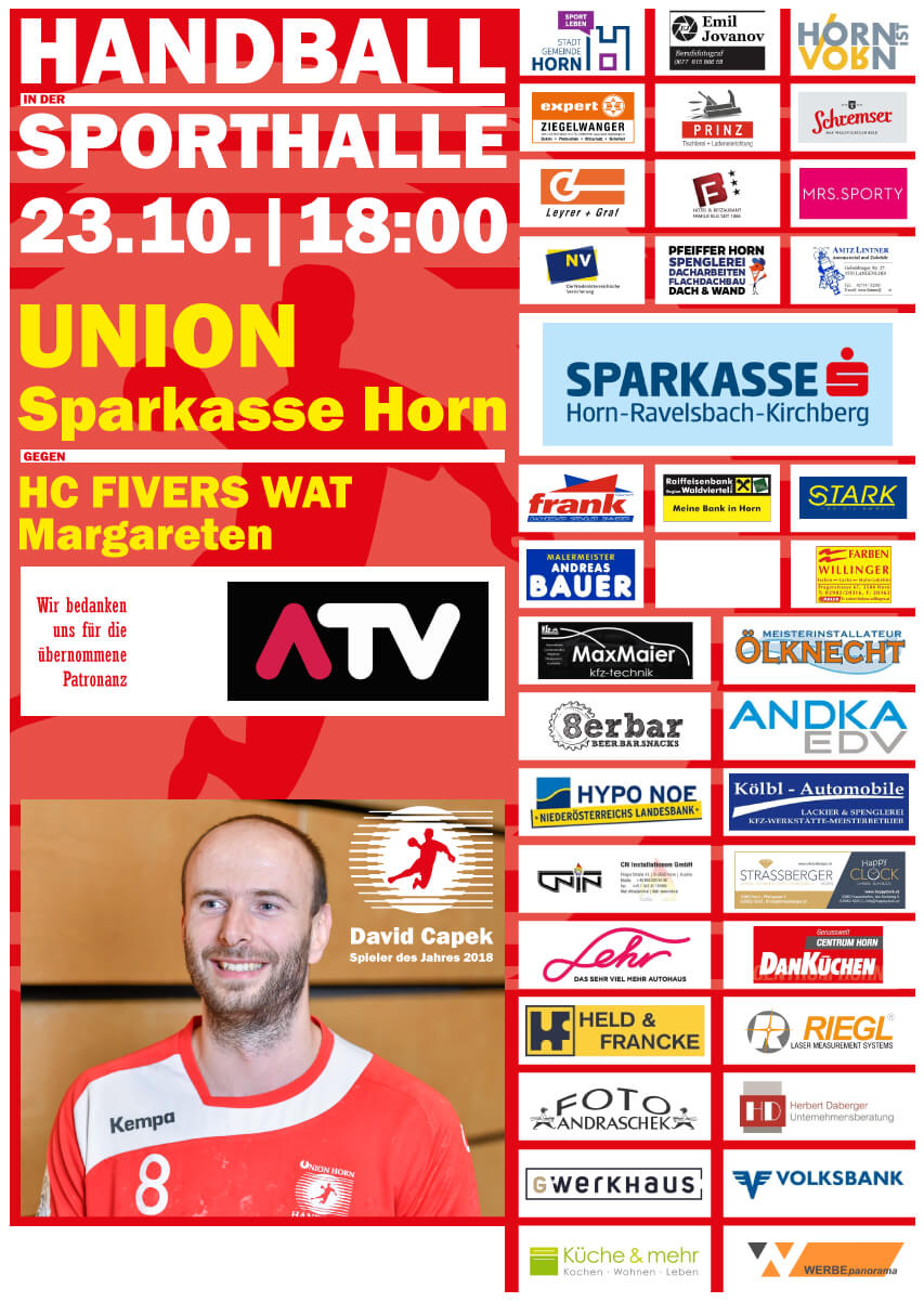 18:00 UhrUnion Sparkasse Horn vs HC FIVERS WAT Margareten3G-Nachweis erforderlich !Patronanz: ATV