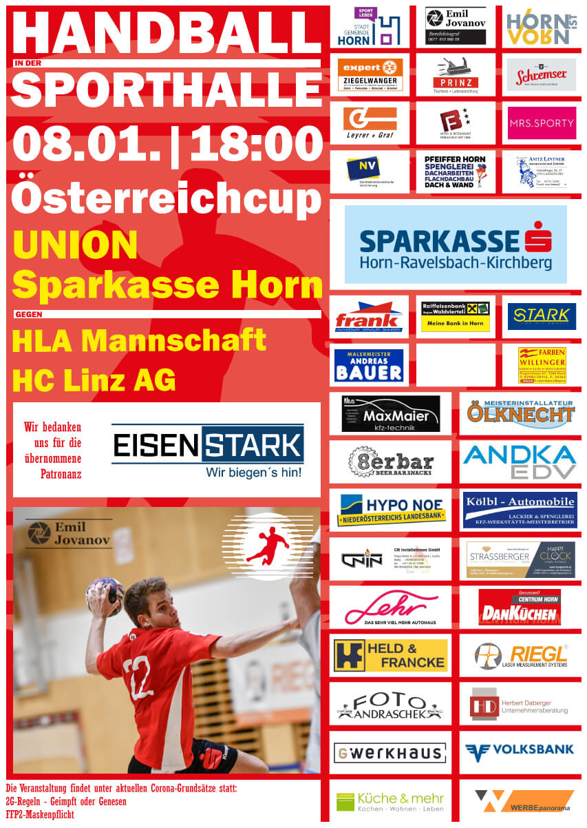 Das verschobene Spiel vom 24.11.2021 wird hiermit nachgeholt!mit Publikum18:00 Uhr - Union Sparkasse Horn vs HLA Mannschaft HC Linz AGPatronanz: EISEN STARK2G-Nachweis nach den gültigen Regeln erforderlich !FFP2-Maskenpflicht