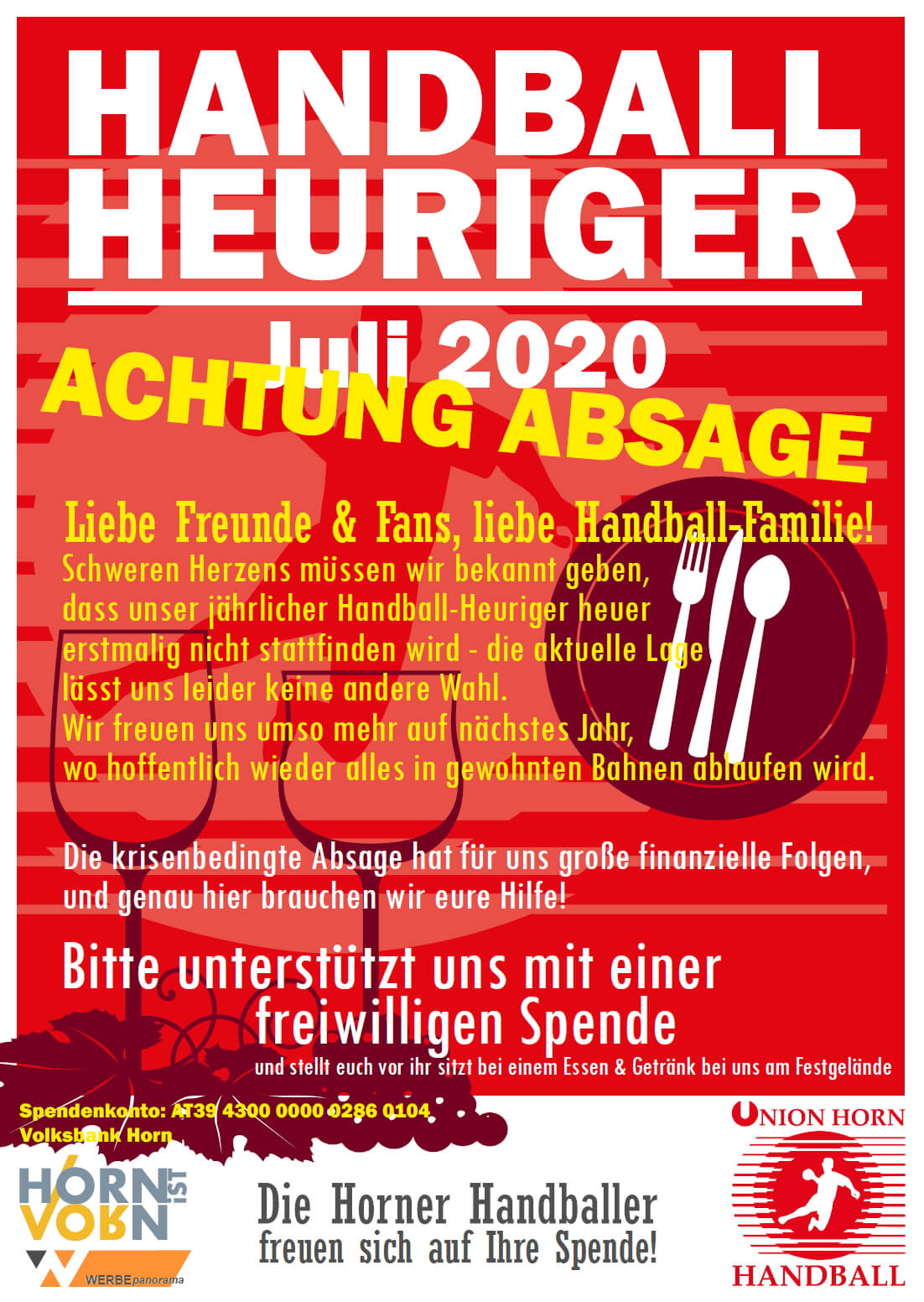 Schweren Herzens müssen wir bekannt geben, dass unser jährlicher Handball-Heuriger heuer erstmalig nicht stattfinden wird - die aktuelle Lage lässt uns leider keine andere Wahl.